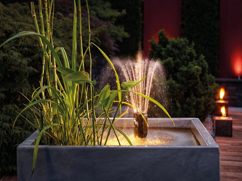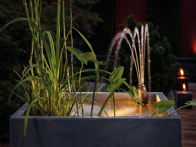 3 Fontänenaufsätze ermöglichen unterschiedliche Wasserspiele. Der Fontänenaufsatz ist Höhenverstellbar und kann an verschiedene Wasserstände angepasst werden.