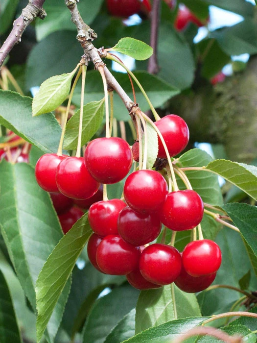 | Frucht: | Groß, leicht oval; dunkelbraunrot; festfleischig, süss-sauer |