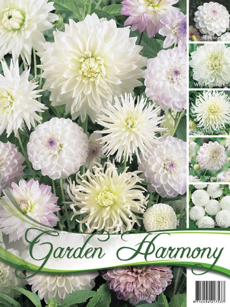 Das Sortiment besteht aus 5 Sorten weißer Dahlien, die aufeinander abgestimmt sind.