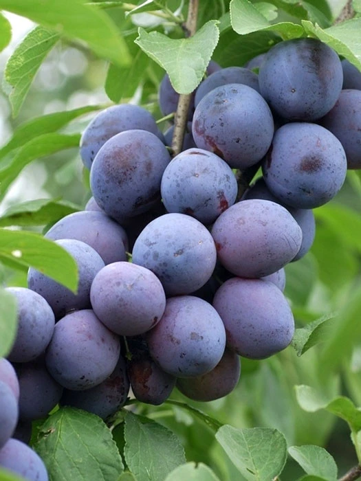 | Frucht: | Mittelgroß bis groß, oval; schwarzblau bis violett, hellbläulich bereift, Haut dünn; Fruchtfleisch rötlich gelb, weich, sehr saftig, süß. |